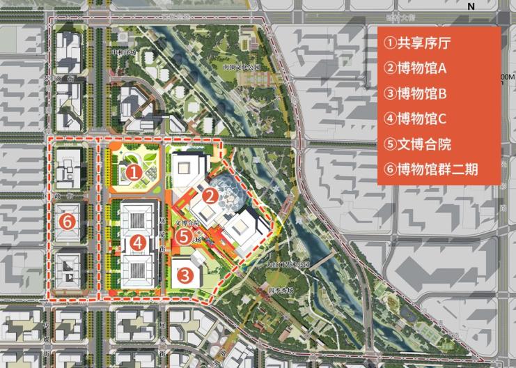 大国文化艺术殿堂将打造无界共享的博物馆群,沿凉水河、苑墙遗迹和南中轴路布局三大博物馆,并以共享序厅、文博合院组织博物馆群公共空间,实现文化博览、综合服务、交通组织等多元功能的复合共生。还将预留博物馆二期用地,为文化事业进一步发展预留空间,未来与博物馆群一期共同围合形成严整、有序的中轴空间。