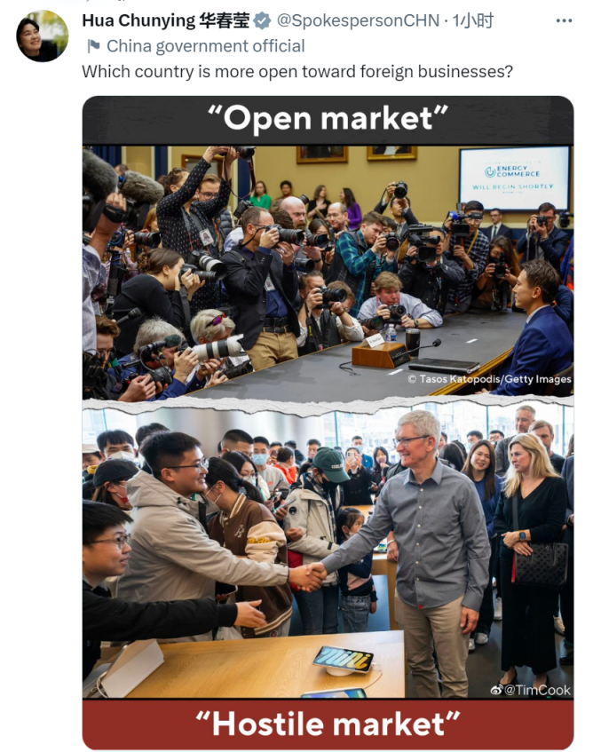 中国是中国,美国是美国。所以,华春莹贴出了一张对比图,一边是美国政客对TikTokCEO周受资的围攻,一边是苹果CEO在北京被热情欢迎。她诘问:哪一个国家对外国企业更开放?