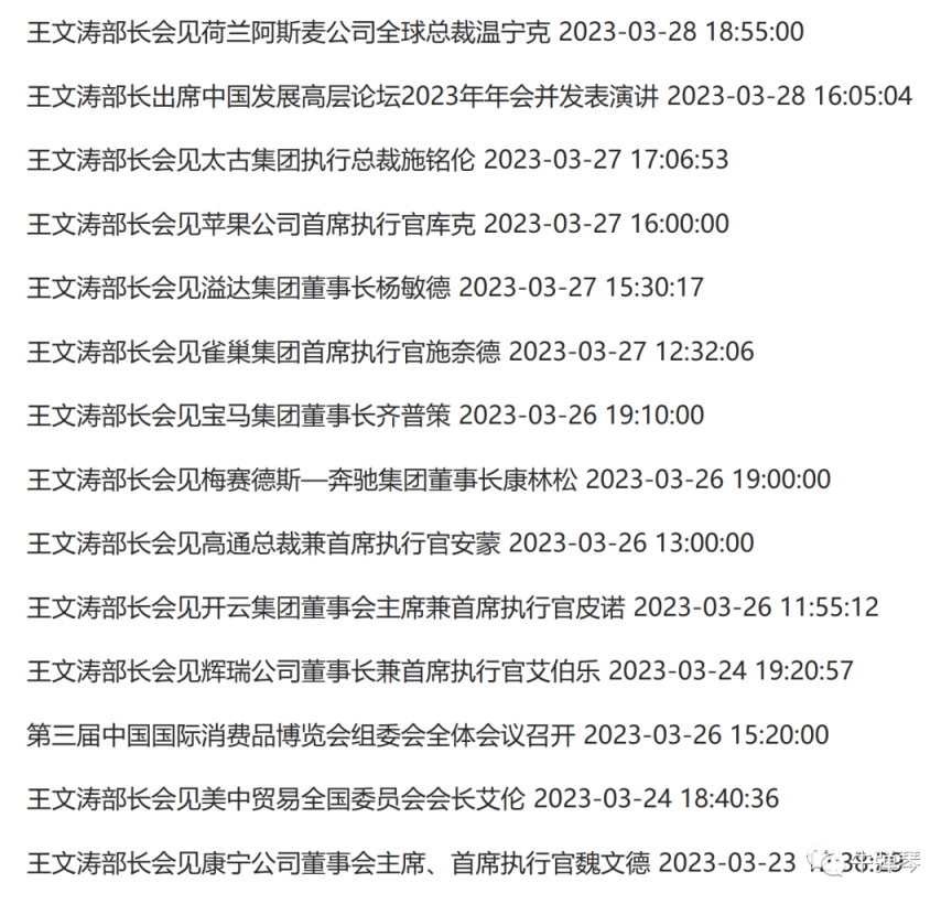 商务部长王文涛尤其忙,看商务部网站,就最近这几天,他就见了太古集团、苹果公司、溢达集团、雀巢集团、宝马集团、梅赛德斯-奔驰集团、高通、开云集团、辉瑞、康宁、宝洁等10多家跨国公司的老总。