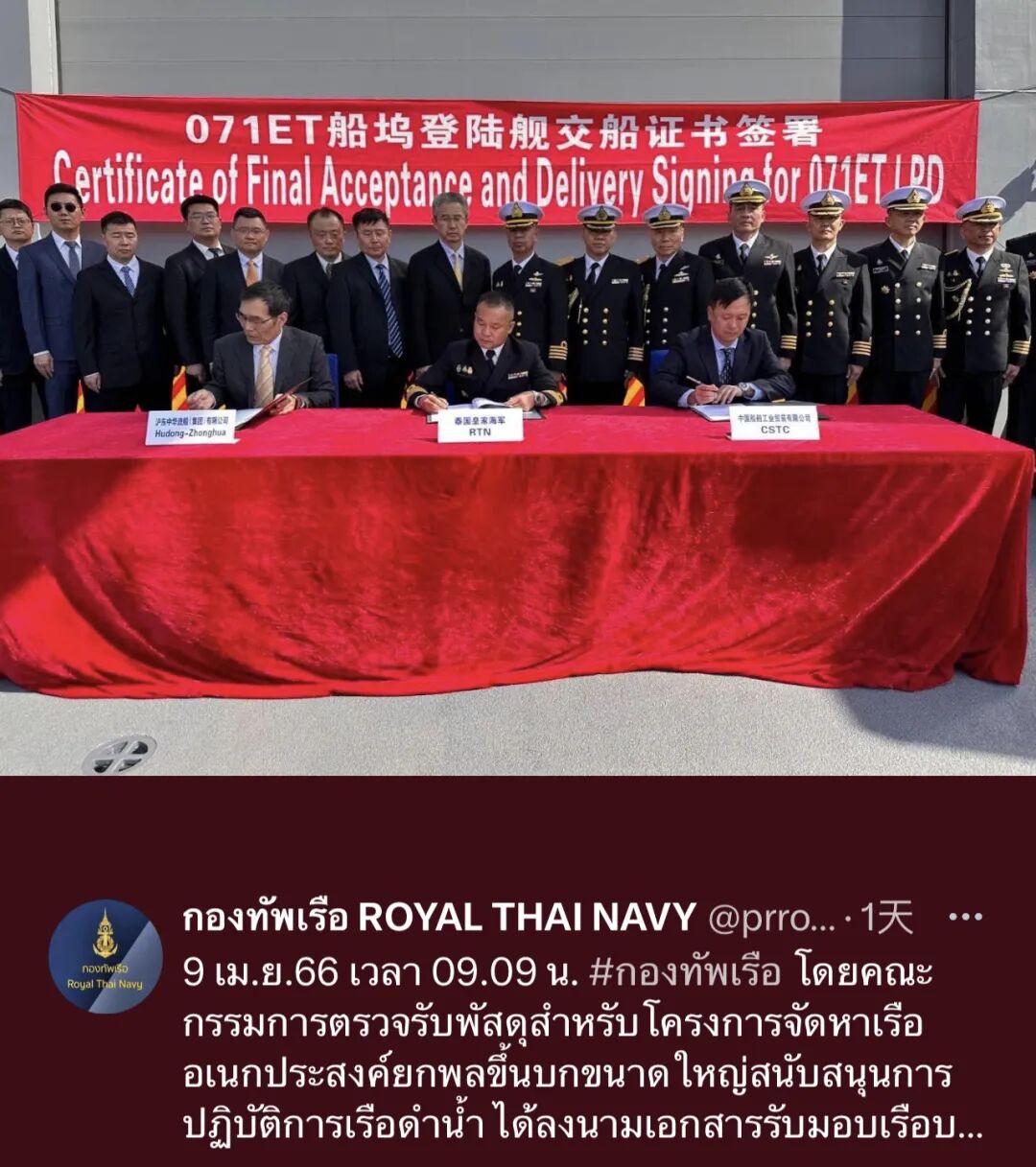 泰国皇家海军4月10日证实,泰国军方代表在上海沪东中华造船厂接收071ET型船坞登陆舰。泰国《曼谷邮报》援引泰国皇家海军 (RTN) 的介绍称,这艘作为潜艇补给舰的新型护卫舰计划于4月27日抵达泰国。随着交付证书的签署,071ET舰成为东南亚地区最大的现役军舰。