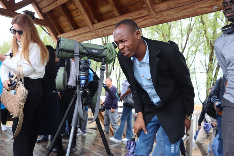 随后,57名媒体记者在园区内由南向北环湖观鸟。木栈道蜿蜒曲折,记者们边走边聊,不停拍照记录。观鸟之余,大家还前往青少年自然教育观察站,现场参观芦苇画制作,感受中国传统文化的魅力。
