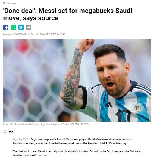 法新社发文,称梅西与沙特球队的合同“已经完成”。