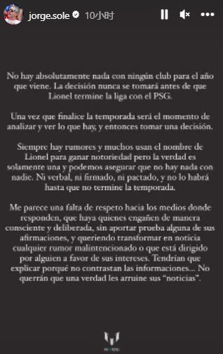 豪尔赫是在个人“照片墙”账户上发布的这篇文章,他写道:“梅西没有与任何俱乐部就下赛季达成任何协议,在梅西结束与巴黎的本赛季联赛前,不会做出决定。一旦赛季结束,将会分析和评估各种情况,然后再做决定。”豪尔赫接着说,总是有很多谣言围绕梅西产生,他再次强调,“现在(梅西)没有与任何俱乐部达成口头协议或签约,并且在本赛季结束之前也不会有。”