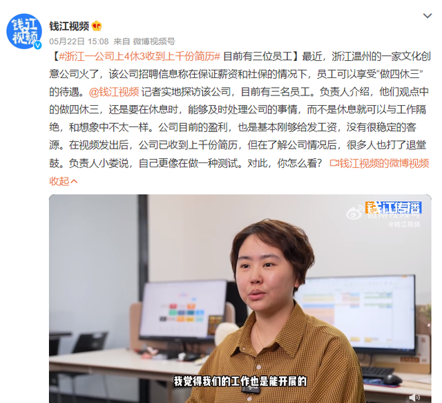(原标题:浙江一公司上4休3收到上千份简历 目前有三位员工)