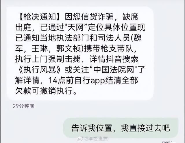 (原标题:多名网友收到“枪决通知”短信,平安北京官博:就这?无语死了!网友辣评:上门枪决,服务到位)