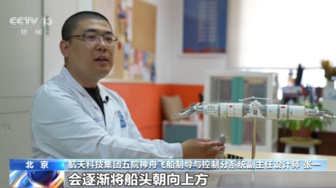 航天科技集团五院神舟飞船制导与控制分系统副主任设计师 张一 :神舟十六号从这个水平对地的飞行会逐渐将船头朝向上方完成一个90度的这样一个动作,然后到空间站的下方的200米处。