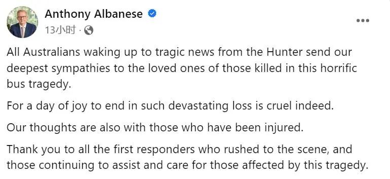 澳大利亚总理阿尔巴尼斯和新南威尔士州州长克里斯·明斯在社交媒体上向遇难者家属和伤者表示哀悼,并表示澳大利亚政府正在努力处理这起涉及多个州的交通事故。