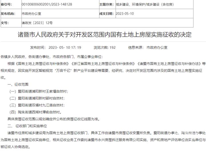 记者了解到,今年5月10日,为了实施开发区智能视觉“万亩千亿”新产业平台建设等需要,诸暨市人民政府对外发布了关于对开发区范围内国有土地上房屋实施征收的决定,其中就包括浦阳新村王家堰自然村。