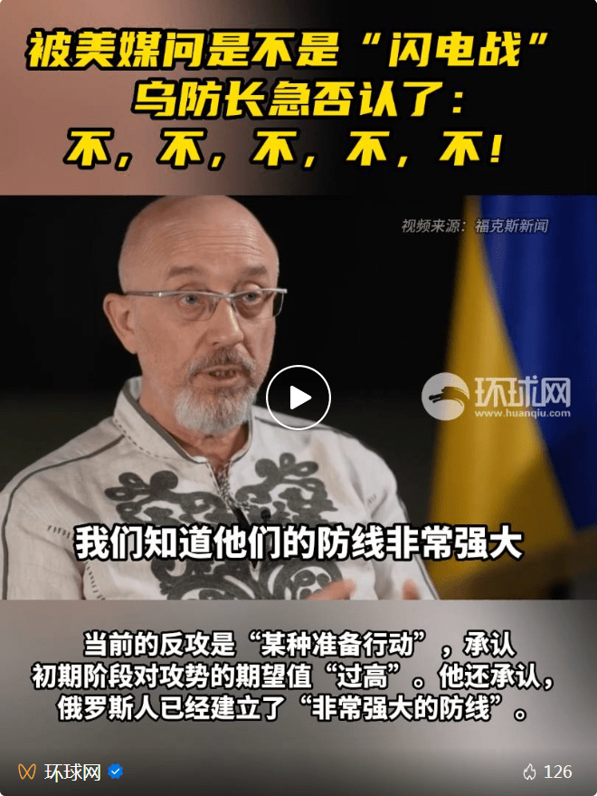 福克斯新闻网称,目前乌克兰的反攻已进入第三周,而反攻进展被抱怨比预期要慢。当被记者问及,此次反攻行动是否是一次主要攻势,或者是乌克兰军队发起的“闪电战”时,列兹尼科夫急于否认,连说“不,不,不,不,不”。另一方面,他还补充称,一旦反攻完全启动,它将是成功的,而现在是“接近胜利的一步”。