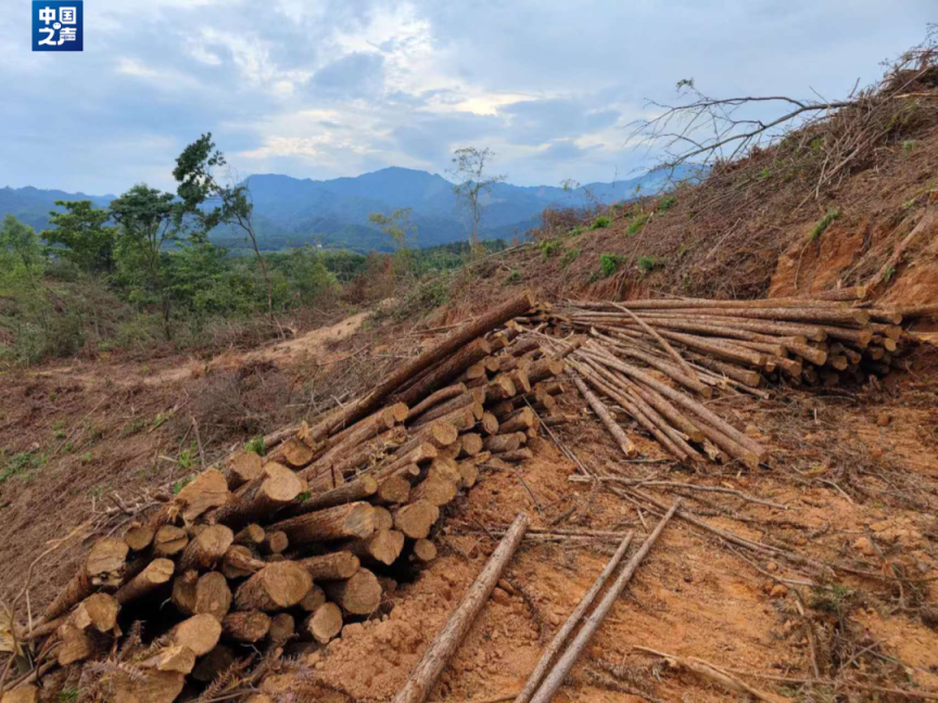 还有多位受访村民告诉记者,除了水田,村庄的部分道路也受到一定影响,被雨水冲下的泥巴堵死。在山庄乡荣溪村和秀水村的集体林地上,记者看到大面积杉木被砍伐,被锯掉的林木凌乱地躺在地上,尚未被清运。