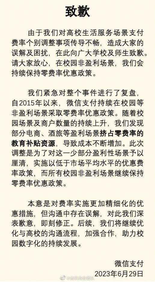 @腾讯微信团队刚刚发布《关于高校费率问题的最新声明》: