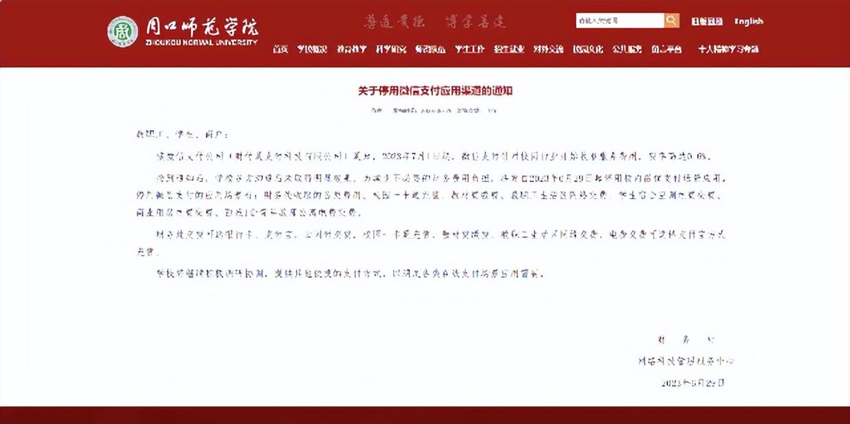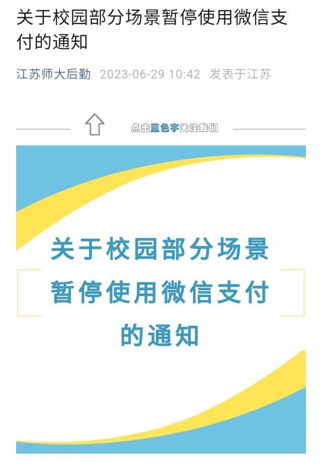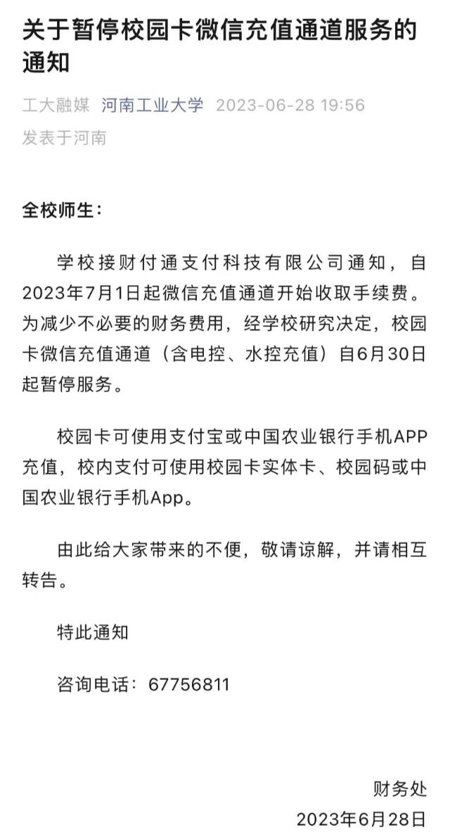 西北大学发布公告称,“因腾讯公司微信支付将于7月1日起对校园场景用户进行精细化管理,除收学费外,其它收费均会受到限制并收取 0.6% 的手续费。为维护师生利益,从6月30日起对校内一卡通用户暂停提供微信扫码支付服务,一卡通校园卡、交通银行 App、云闪付、支付宝等渠道正常使用,望各位师生周知。”