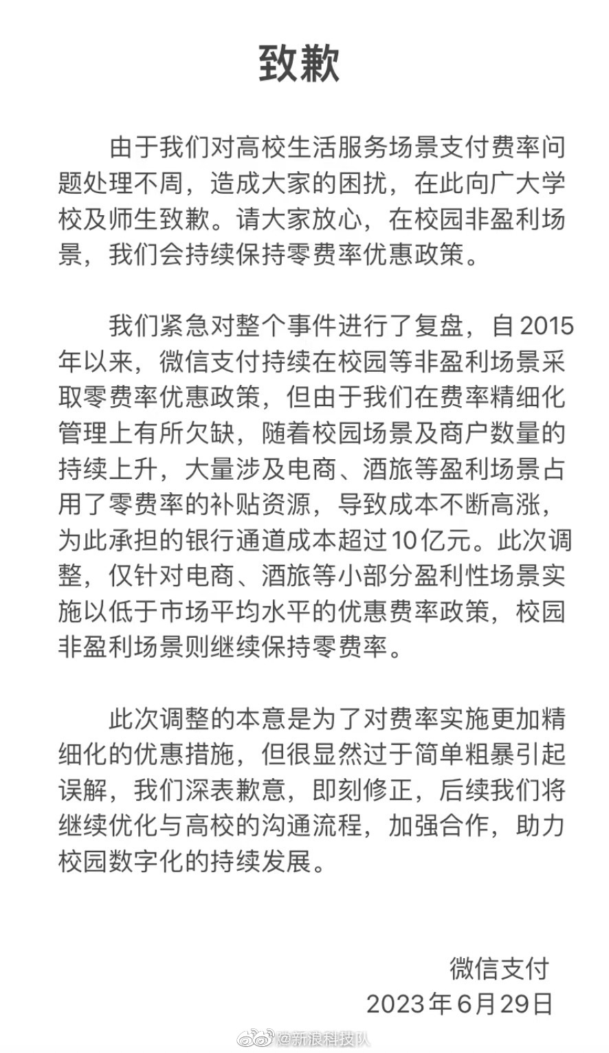 对此,@腾讯微信团队 发文:由于我们对高校生活服务场景支付费率问题处理不周,造成大家的困扰,在此向广大学校及师生致歉。请大家放心,在校园非盈利场景,我们会持续保持零费率优惠政策。