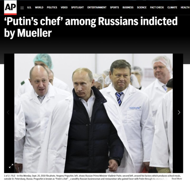 据美联社报道,2018年2月16日,普里戈任和另外12名俄罗斯人及3个俄罗斯组织被美国政府指控参与了2016年美国总统大选期间影响政治舆论的大规模行动。根据起诉书,普里戈任和他的公司向互联网研究机构(Internet Research Agency)提供了大量资金,这是一家总部位于圣彼得堡的组织。该组织通过创建虚构的社交媒体角色和以美国人名义购买的虚假广告来影响白宫竞选。此次事件广泛称作“通俄门”。