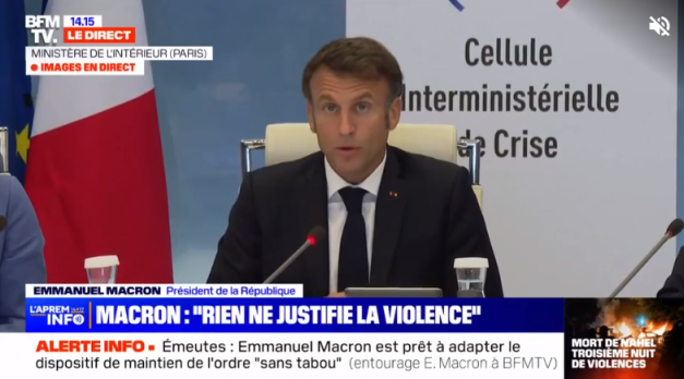 报道称,马克龙30日当天与法国多名部长召开危机应对会议时发表了上述言论。他在会议上称,法国内政部将使用更多手段来应对暴力抗议,并谴责说,“利用一名少年死亡的行为是不可接受的”。
