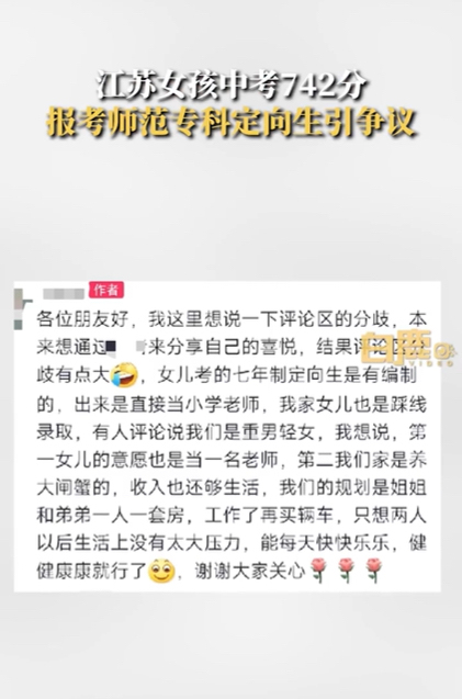 (原标题:女孩中考742分报考师范专科引争议,家长:七年贯通培养出来有编制)