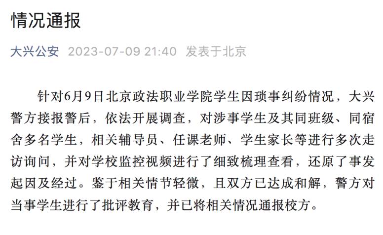 (原标题:大兴警方通报北京政法职业学院学生纠纷:双方已和解)