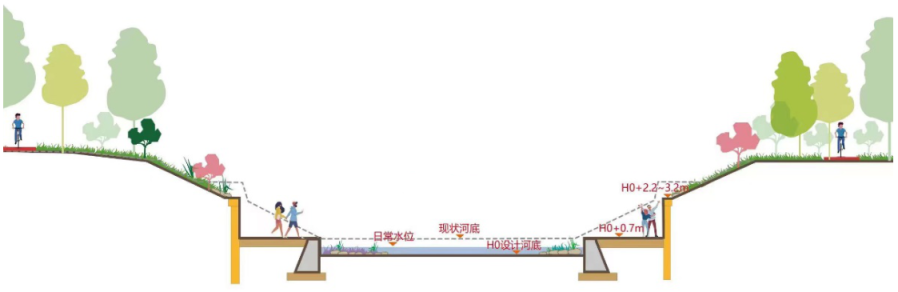金水河综合整治工程设计采取公开招标方式,邀请国内一流水利工程设计公司参与竞标,经严格评审,最终由中国电建集团华东勘测设计研究院中标。在设计中,综合考虑金水河综合整治涉及护岸、堰坝、水闸及清淤清障等多个方面,基于河两岸路网密集、临河建筑物众多、以及柳树和法桐等高大乔木密布等实际情况,如果直接开挖拓宽,对环境影响较大,故采取H型护岸桩挡墙方案。该方案能够尽可能利用河道两岸的既有绿色植被,同时有效降低投资,结构安全性也能够满足规范要求。