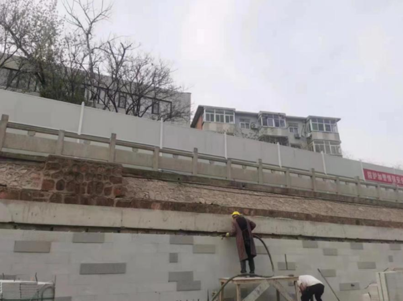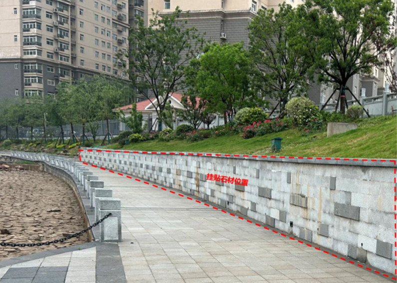 因护岸桩挡墙为H型预制构件,完成后接缝处不可避免存在不平整粗糙面,汛期对行洪有一定程度的影响,非汛期对行人也存在一定的安全风险,且裸露的护岸桩或挡墙观感较差,根据国内类似工程经验,对表面进行处理是必要的。目前,国内采用的通用处理方式主要有石材挂贴、石材湿贴、混凝土预制板材挂贴等。根据测算,单位面积投资中,混凝土预制板材挂贴单价过高,石材挂贴和湿贴投资相当,但石材湿贴易脱落、影响安全,经技术经济比较,选用石材挂贴工艺。具体施工中,所用石材为花岗岩,而非大理石,采用的是“先挂石材、后灌浆”的挂贴施工工艺,而非一般建筑立面采用的“干挂石材”施工工艺,具有较好耐久性、安全性。经计算,金水河若遇100年一遇洪水,其洪水流速在2—3米每秒,挂贴花岗岩立面可抵抗该流速的冲刷。