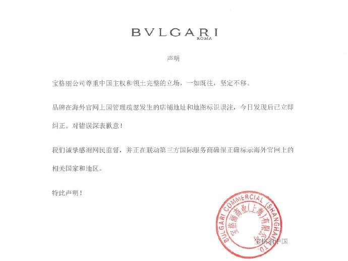 (原标题:宝格丽就“官网把台湾列为国家”致歉:已立即纠正,对错误深表歉意)