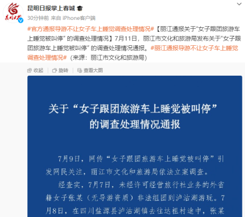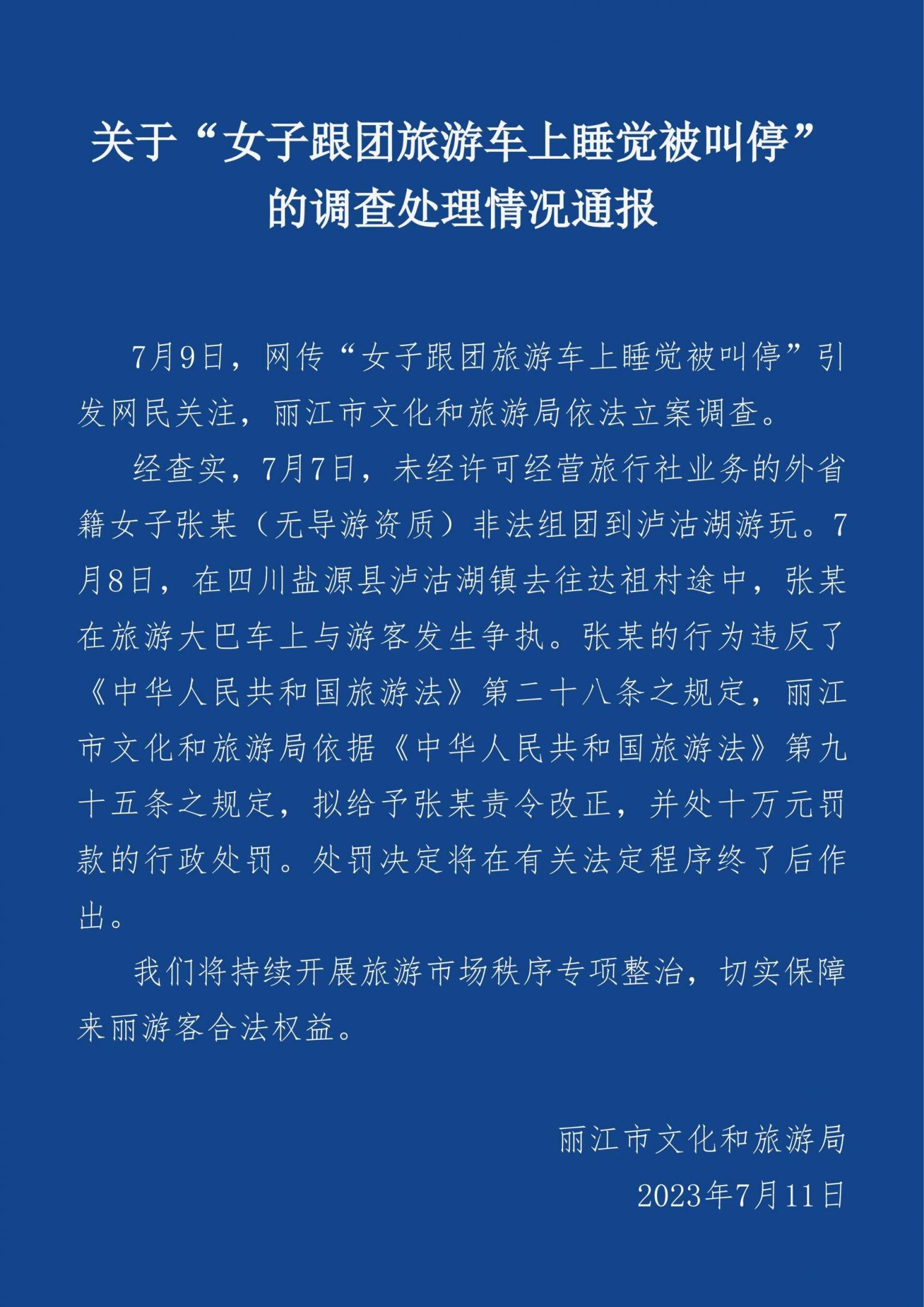 7月11日,丽江市文化和旅游局发布关于“女子跟团旅游车上睡觉被叫停” 的调查处理情况通报。详情如下: