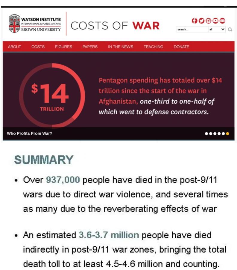 耿直哥查询公开资料发现,这个450万的死亡数字出自布朗大学沃森国际与公共事务学院一项名为“战争的代价”的研究项目。该项目对过去22年遭美国战争荼毒的阿富汗、伊拉克、利比亚、索马里、叙利亚,以及巴基斯坦的部分地区进行了调查,认为美国的战争直接导致93.7万人死亡,还有大约360-370万人间接死亡。