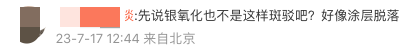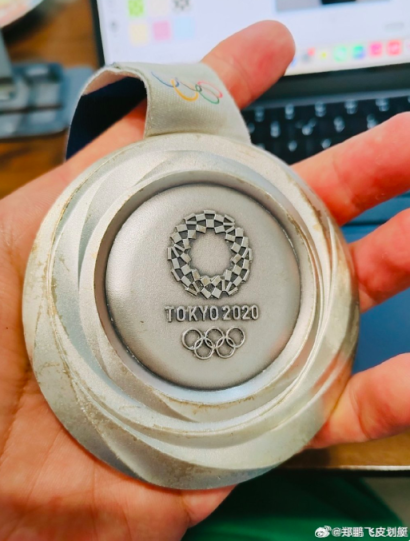 记者注意到,在郑鹏飞晒出的照片中,奖牌的银色部分的确出现了明显的氧化痕迹,看起来就像“生锈”了一样。