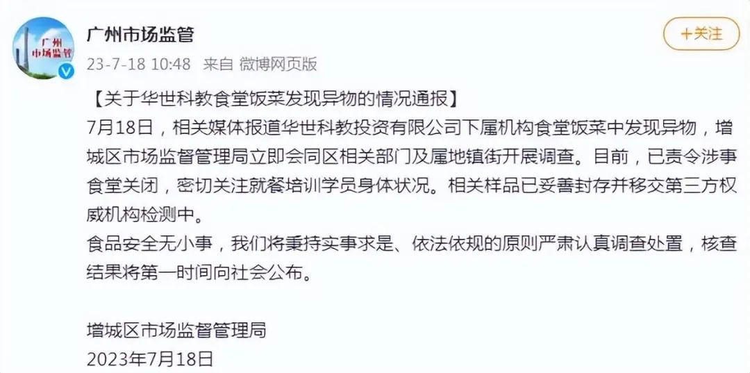 据广州增城发布官博消息,7月18日,有关媒体报道华世科教食堂饭菜中发现异物情况,我局高度重视,将经公安部门封存的异物样品送广州市食品检验所和广州市质量监督检测研究院进行检测,并邀请相关行业专家参与。