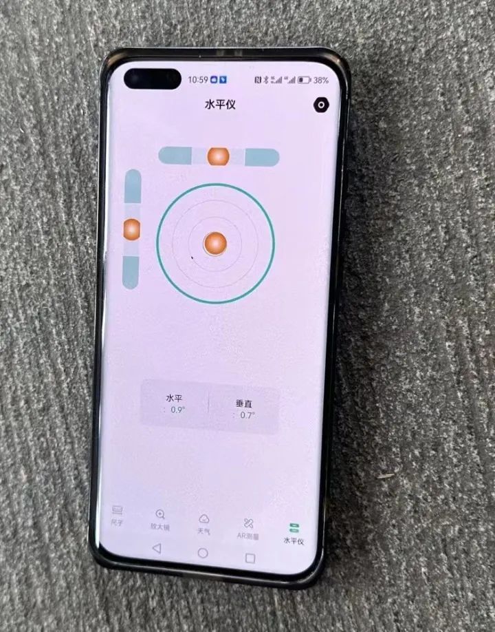 站在岸边从远处观察夕影亭,似乎亭子向水面轻微倾斜,但单凭肉眼,的确很难判断。站在亭子中央,潮新闻记者调出手机自带水平仪,将手机放在亭子地面上,仪器显示水平0.9°,垂直0.7°,水平仪显示重心向右前方轻微偏向。