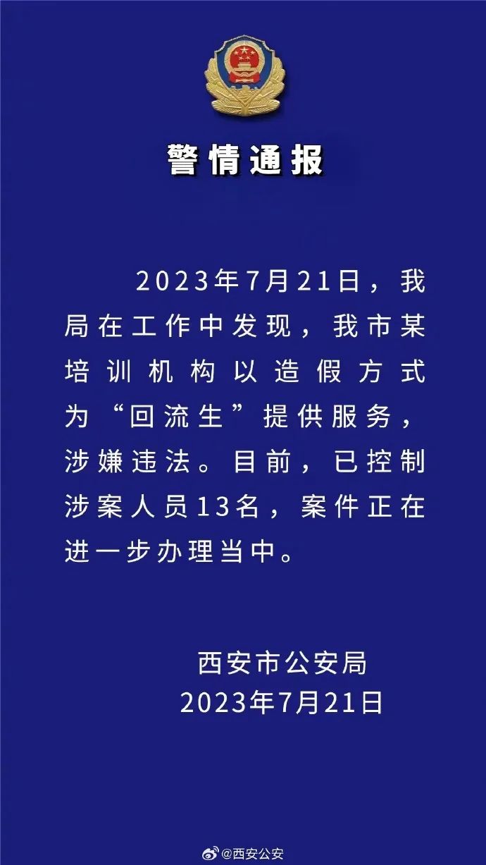 7月21日23时许, 西安市公安局针对网传今年该市中考“回流生”问题进行通报:2023年7月21日,该局在工作中发现,该市某培训机构以造假方式为“回流生”提供服务,涉嫌违法。