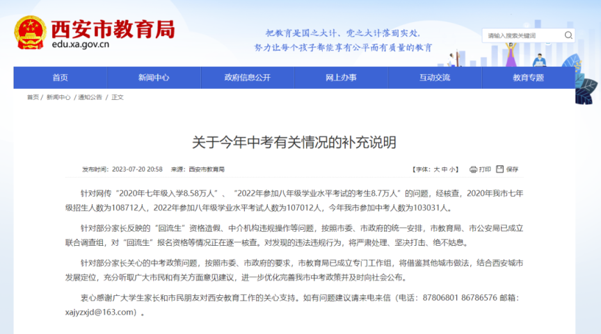 近日,网传“2023年西安11万中考生,其中4万是河南回流生”,部分家长对中考报名人数及资格等问题提出关切和质疑,西安市教育局分别于7月18日和7月20日两次回应此事。
