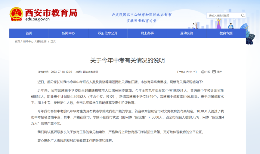 7月18日,西安市教育局就中考有关情况说明称,“今年全市九年级参加中考103031人,为具有西安市学籍或西安市户籍的学生,符合教育部和省市对义务教育的有关规定。103031人通过了西安市中考报名资格审查,其中,户籍在西安市、学籍不在西安市就读(即网传‘回流生’)3608人,占全市报名人数的3.5%,网传‘回流生4万人’信息严重不实。”