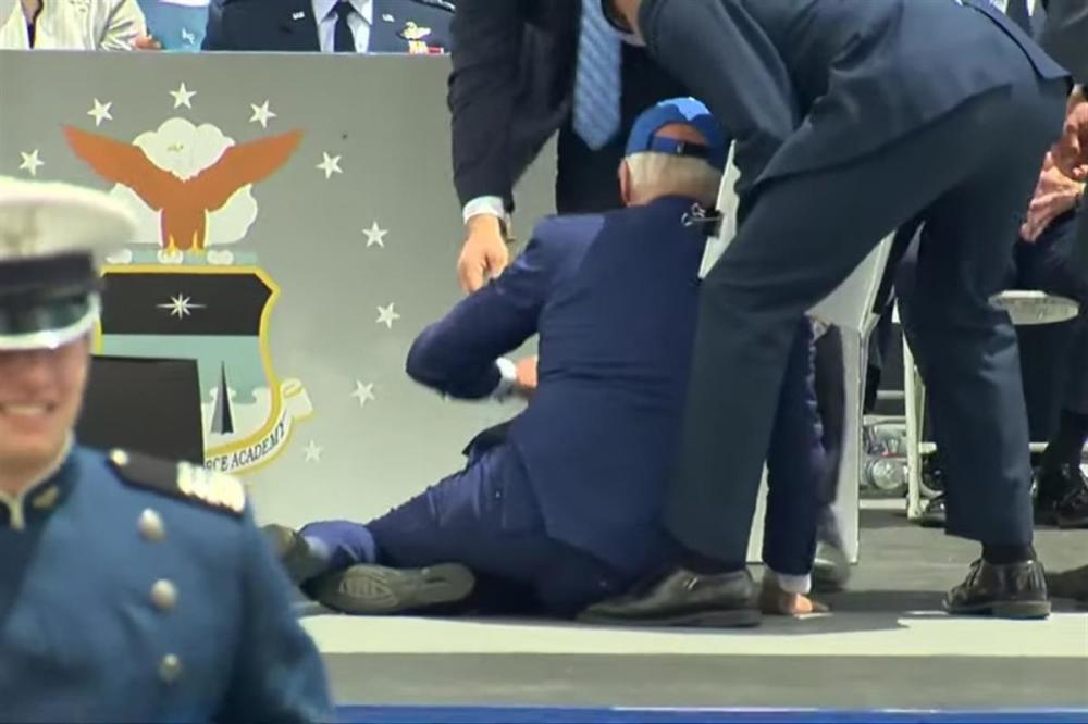 拜登在空军学院被沙袋绊倒(图源:路透社)