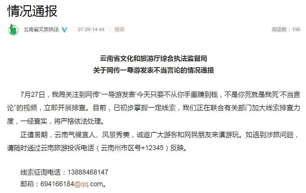 7月29日,云南省文化和旅游厅综合执法监督局通过其官方微博发布关于网传一导游发表不当言论的情况通报,全文如下: