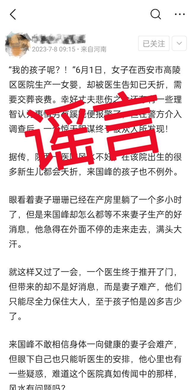 2023年7月8日,西安高陵网警在工作中发现,有今日头条用户发布帖文称,6月1日名为“珊珊”的孕妇在高陵区医院妇产科生产后被医生告知婴儿夭折,且医院风水不好,就诊孕妇分娩婴儿多半夭折,该医院有贩卖婴儿嫌疑。该帖文持续发酵,引发网友热切关注和评论。