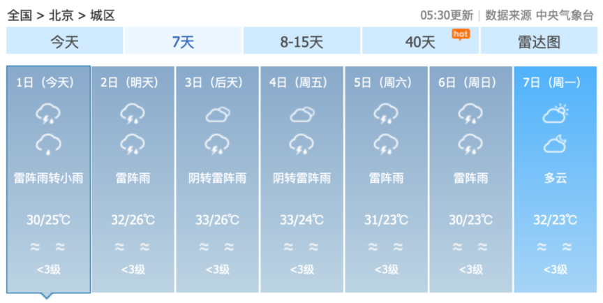 北京市气象台2023年8月1日7时降级发布暴雨黄色预警信号:本市降雨趋于减弱,预计8月1日8时至2日8时,本市大部地区有中雨,局地暴雨;伴有小时雨强超过50毫米的短时强降雨,山区及浅山区出现强降水诱发的中小河流洪水、山洪、地质灾害等次生灾害风险仍较大,城市低洼地区容易出现积水,请注意防范。