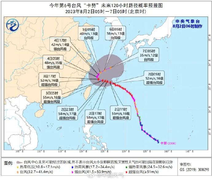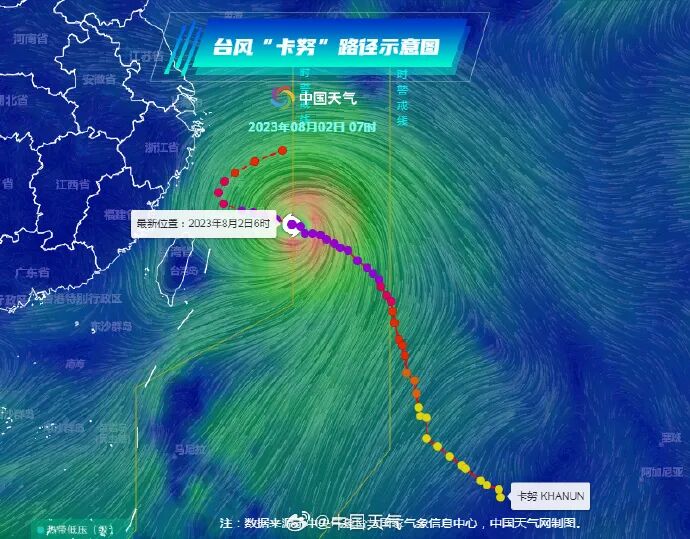 中央气象台8月2日06时继续发布台风蓝色预警:今年第6号台风“卡努”(KHANUN)(超强台风级)的中心今天(2日)早晨5点钟位于浙江省玉环市东偏南方向约630公里的西北太平洋洋面上,就是北纬25.7度、东经127.0度,中心附近最大风力有16级(52米/秒),中心最低气压为935百帕,七级风圈半径300-360公里,十级风圈半径140公里,十二级风圈半径90公里。预计,“卡努”将以每小时10-15公里的速度向西偏北方向移动,强度还将有所增强,即将进入我国东海,然后逐渐向浙江中部至福建北部一带沿海靠近。