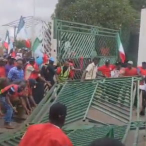 数百名抗议者在首都阿布贾冲破了国民议会第一道大门,试图强行闯入议会。