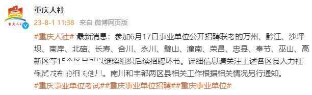 消息显示南川和丰都相关工作另行通知(来源:重庆人社微博)