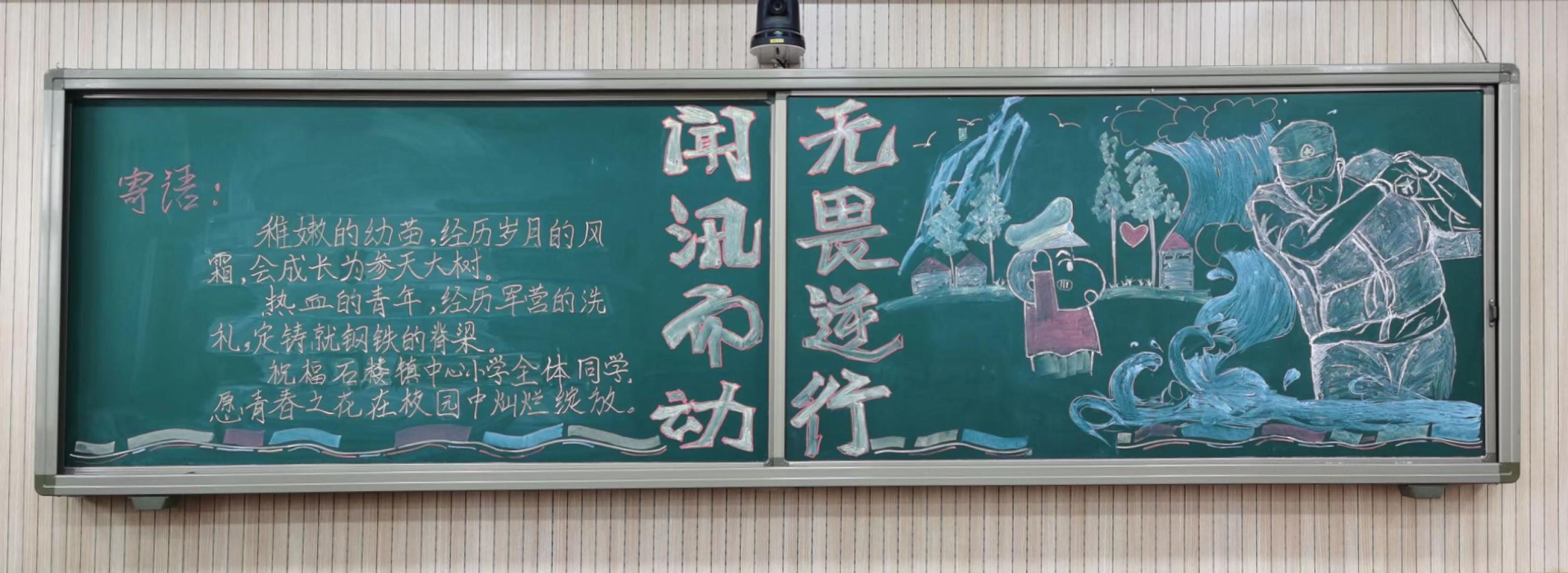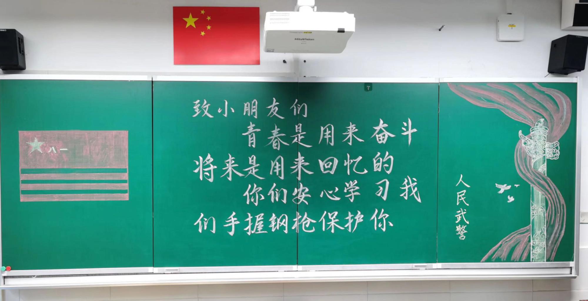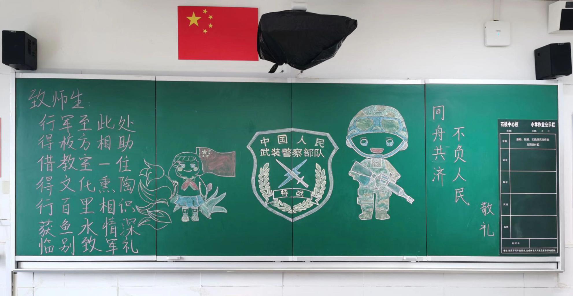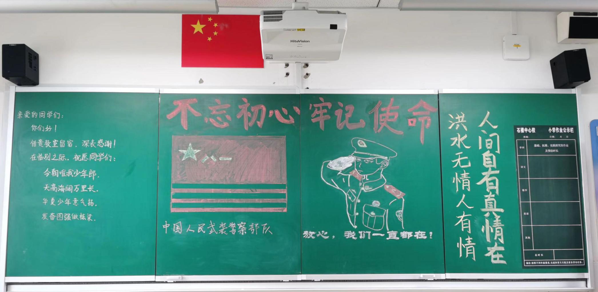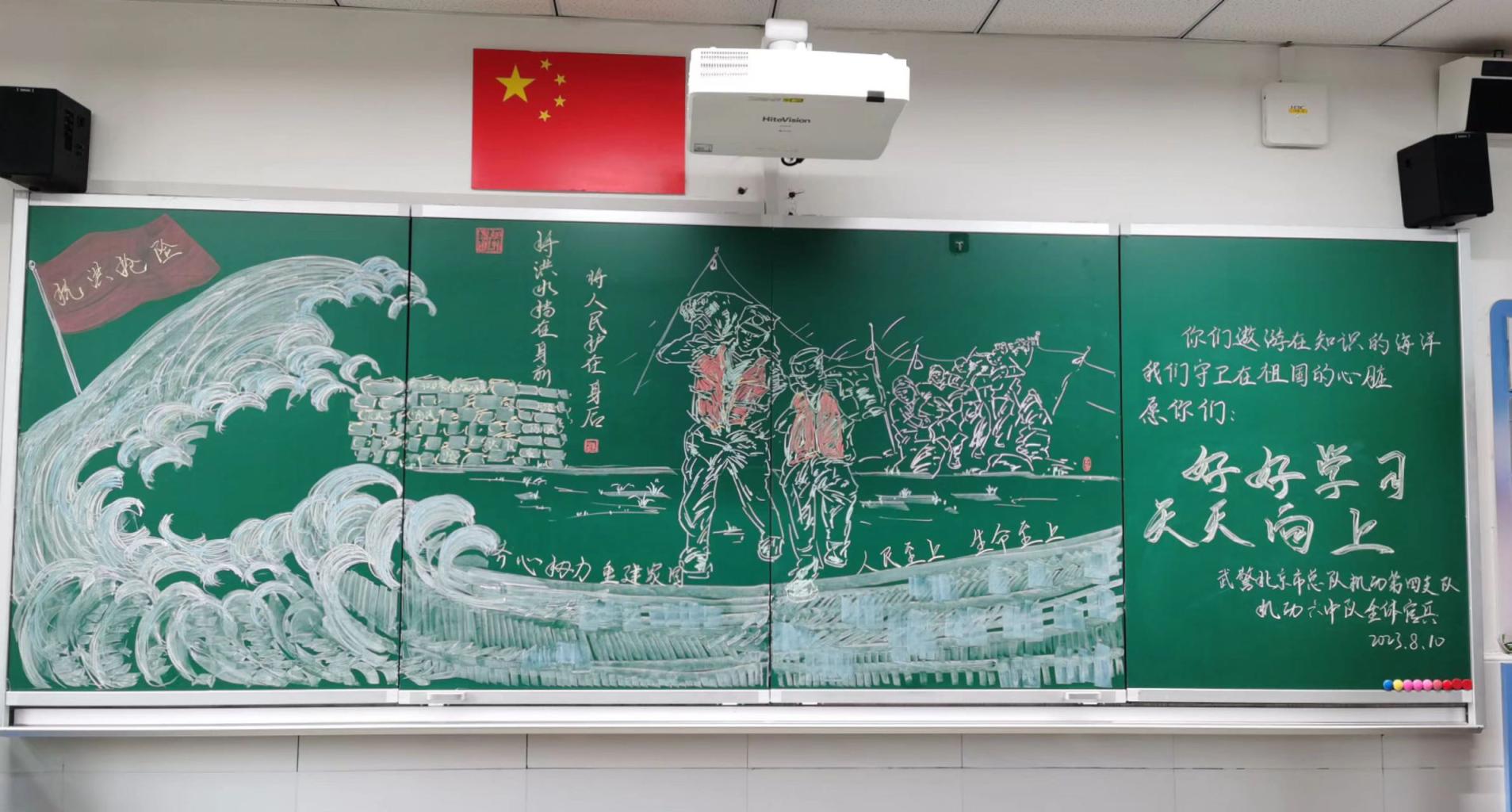在此次强降雨过程中,房山区石楼镇域受灾严重,武警北京总队机动第四支队的500名官兵前来支援,石楼中心小学成了战士们的临时营地。离校前,战士们给学校留下了一份珍贵的礼物:在很多教室里绘制了精美的板报,“闻汛而动,无畏逆行”“洪水无情,人间有爱”“人民至上,军民情深”……