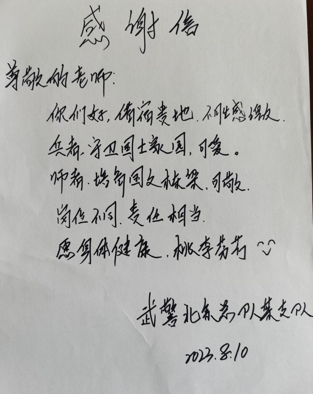 为了让孩子们切身感受军旅生活,战士们还给孩子们留下了压缩饼干、野战速热餐等食品。在他们居住过的办公室里,也留下了写给老师的信件,信中写道:兵者,守卫国土家园,可爱;师者,培育国之栋梁,可敬;岗位不同,责任相当。
