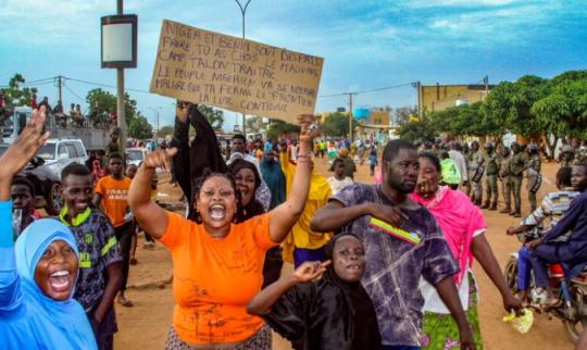 8月11日,数千名尼日尔政变军方支持者聚集在尼亚美郊区的法国军事基地附近,高呼“打倒法国、打倒西共体”,抗议西共体针对尼局势启动地区常备部队的决定。