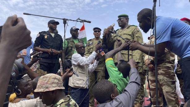 尼日尔政变领导人之一的图姆巴在尼亚美街头对支持者讲话。