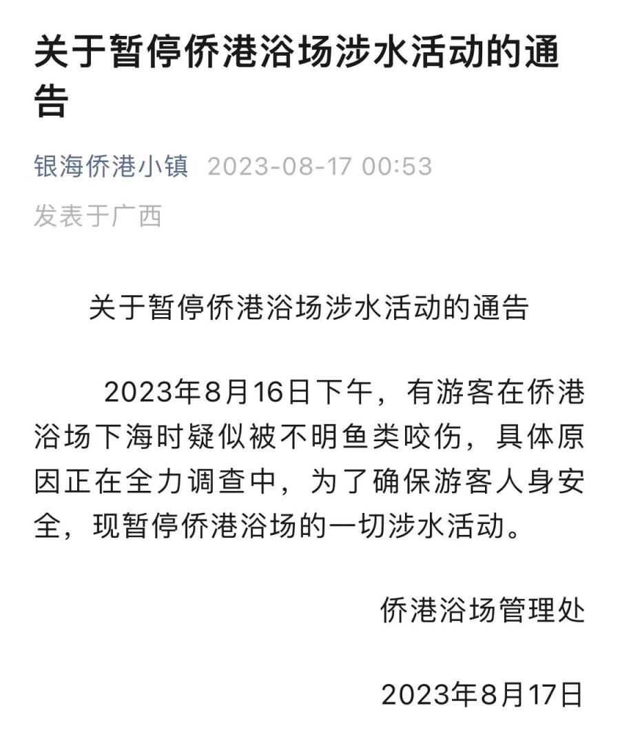 2023年8月16日下午,有游客在侨港浴场下海时疑似被不明鱼类咬伤,具体原因正在全力调查中,为了确保游客人身安全,现暂停侨港浴场的一切涉水活动。