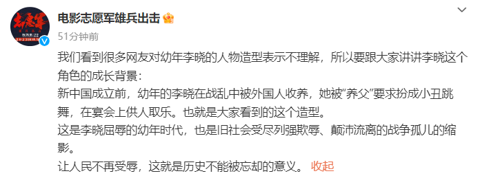 17日下午,@电影志愿军雄兵出击 官方微博回应了上述争议:我们看到很多网友对幼年李晓的人物造型表示不理解,所以要跟大家讲讲李晓这个角色的成长背景:新中国成立前,幼年的李晓在战乱中被外国人收养,她被“养父”要求扮成小丑跳舞,在宴会上供人取乐。也就是大家看到的这个造型。这是李晓屈辱的幼年时代,也是旧社会受尽列强欺辱、颠沛流离的战争孤儿的缩影。让人民不再受辱,这就是历史不能被忘却的意义。