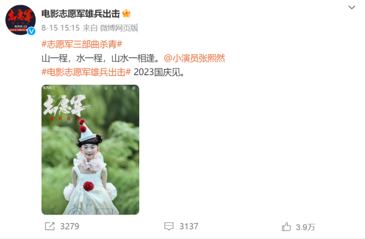不过,众多网友热议的是该电影官方微博15日发布的一则图文帖子。这则帖子发布于15日15时15分,内容为“山一程,水一程,山水一相逢。@小演员张熙然 #电影志愿军雄兵出击#2023国庆见”。
