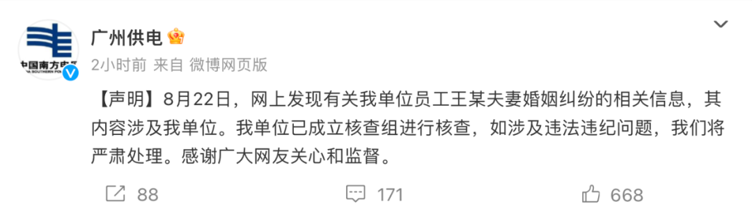 8月22日晚,广州供电局发布声明:网上发现有关我单位员工王某夫妻婚姻纠纷的相关信息,其内容涉及我单位。我单位已成立核查组进行核查,如涉及违法违纪问题,我们将严肃处理。感谢广大网友关心和监督。