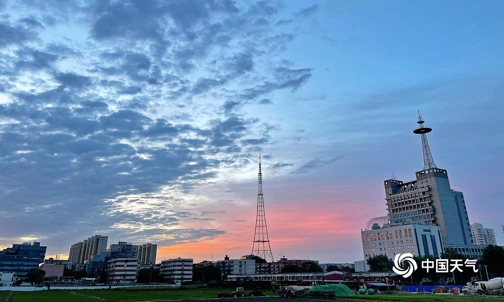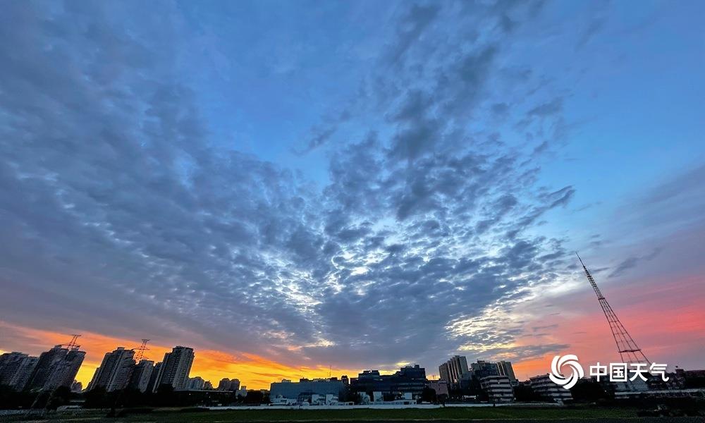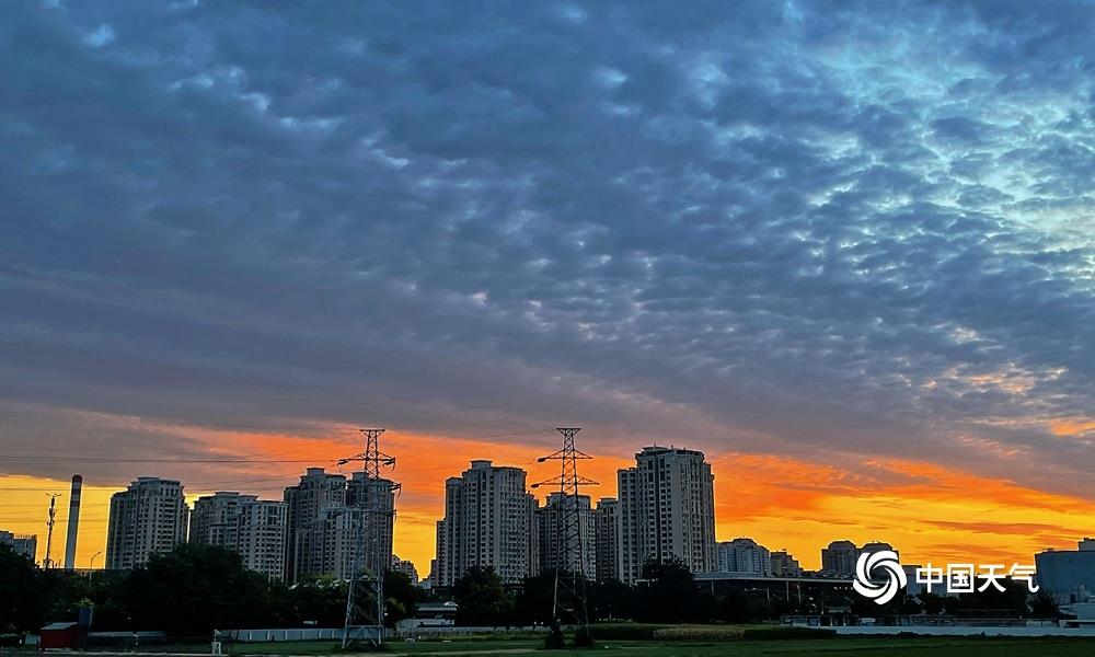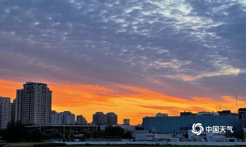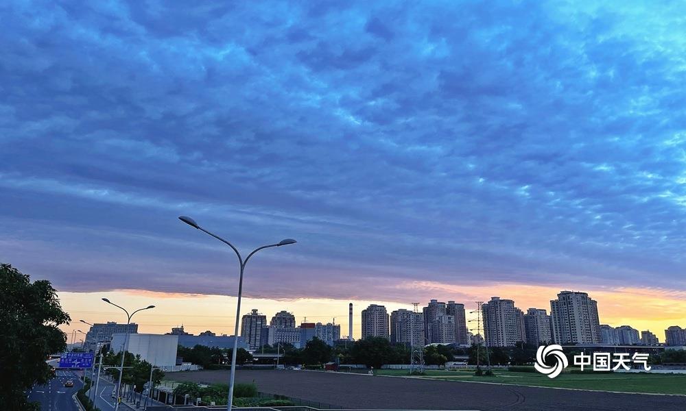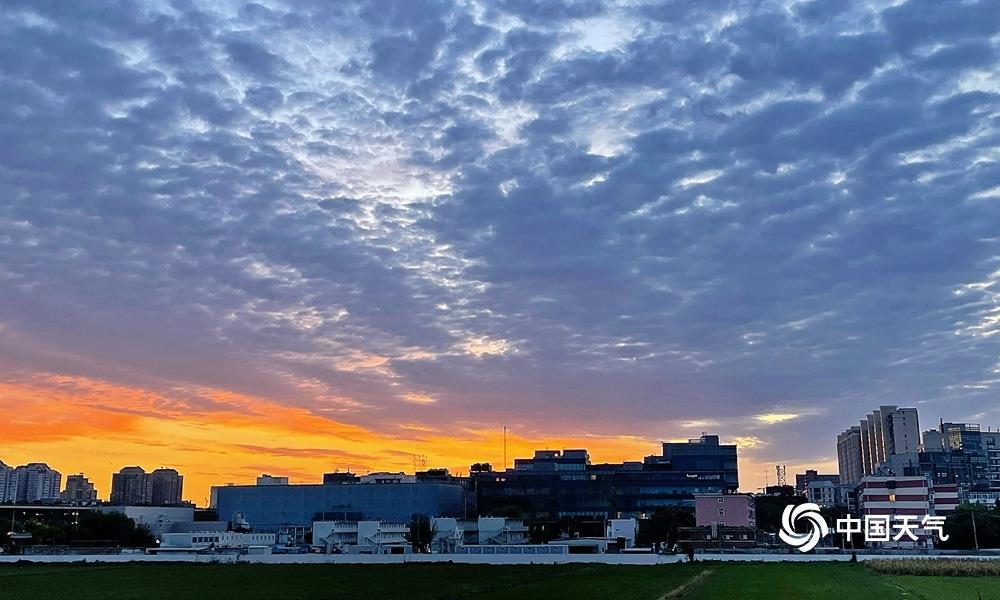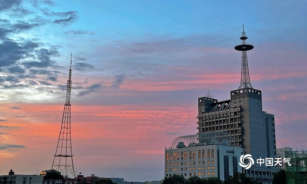 今天(9月19日)早晨,北京云层如丝绒地毯般铺展开来,与远处橙粉朝霞将天空映衬得格外美丽。