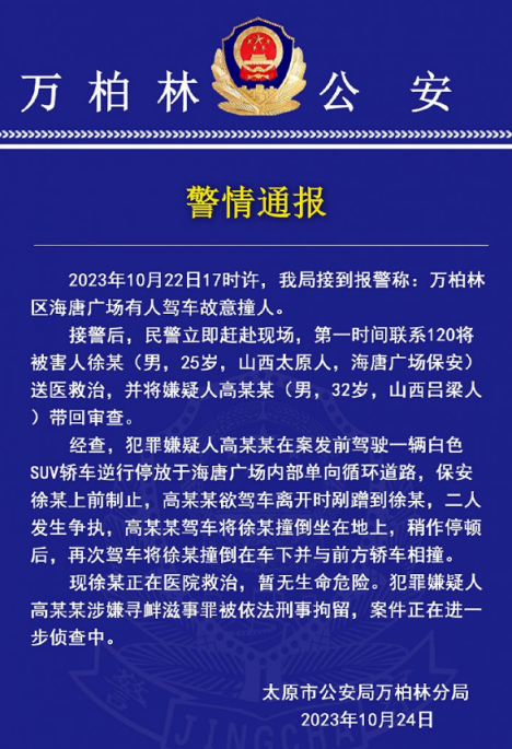 2023年10月22日17时许,我局接到报警称:万柏林区海唐广场有人驾车故意撞人。