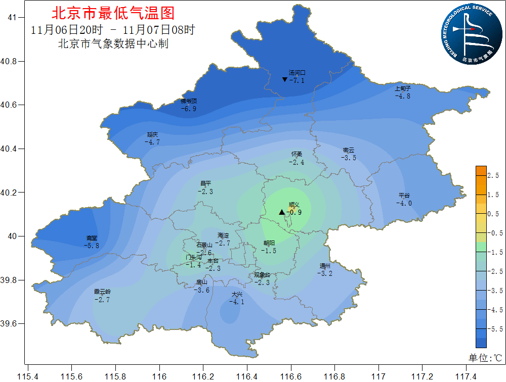 6日20时至7日08时,南郊观象台最低气温为-2.3℃(7日06:00)